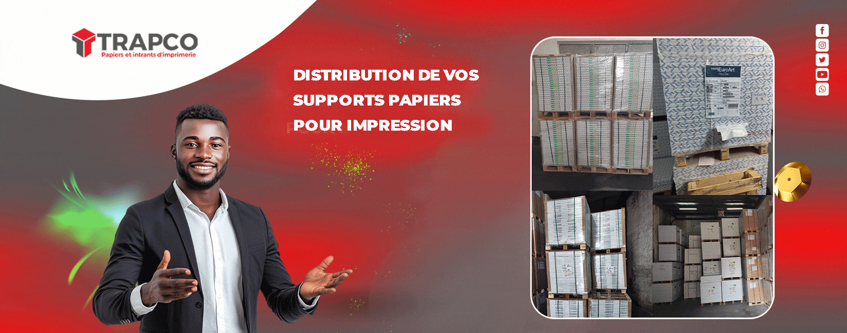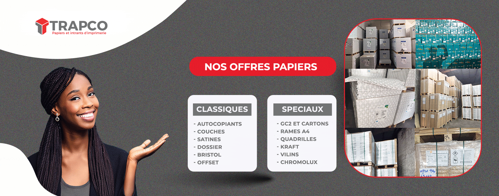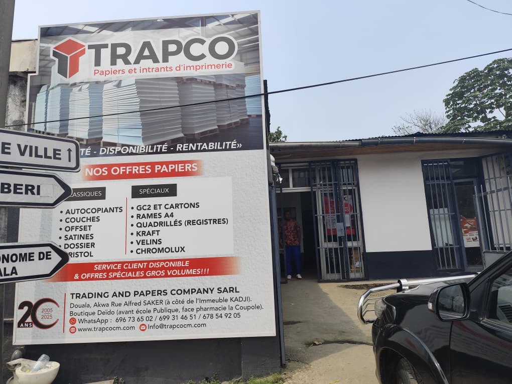 TRAPCO SARL est une entreprise spécialisée dans la distribution de papiers et de consommables pour les imprimeurs au Cameroun et dans la sous-région. Nous offrons une gamme complète de papiers couchés, offset, autocopiants, satinés et bristol, reconnus pour leur qualité et leur constance. Notre mission est d’accompagner les imprimeurs dans la réussite de leurs productions grâce à des produits fiables, disponibles et proposés au meilleur rapport qualité/prix. Avec un service réactif et une expertise sectorielle affirmée, TRAPCO se positionne comme un partenaire de confiance pour les professionnels des arts graphiques.